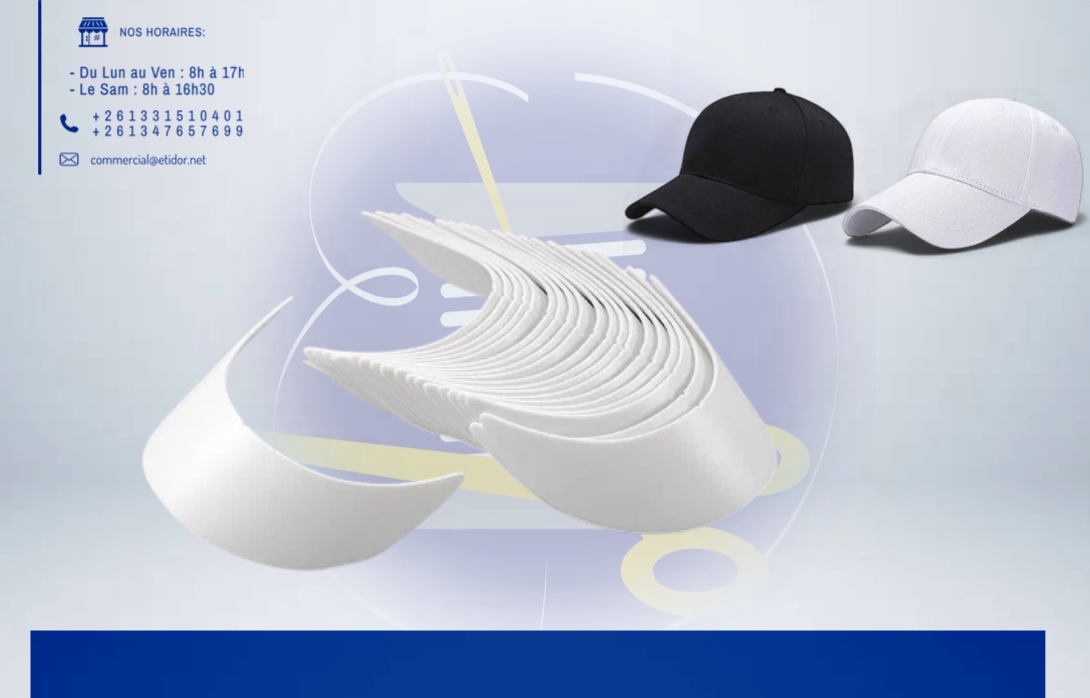 Donnez une belle tenue à vos casquettes avec ce viseur léger et résistant. Il assure une visière bien formée, durable et confortable, idéal pour la fabrication ou la personnalisation de modèles tendance. 💬Pour effectuer votre commande, veuillez prendre en photo le produit et valider vers ce lien: m.me/etidorshop ou contacter notre commercial aux : 📞 +261 34 02 270 83 / +261 33 15 104 01 📧commercial@etidor.net