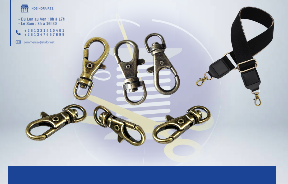 Mousqueton en métal bronze au style vintage, solide et pratique pour vos créations de sacs, bijoux ou porte-clés. 💬Pour effectuer votre commande, veuillez prendre en photo le produit et valider vers ce lien: m.me/etidorshop ou contacter notre commercial aux : 📞 +261 34 02 270 83 / +261 33 15 104 01 📧commercial@etidor.net