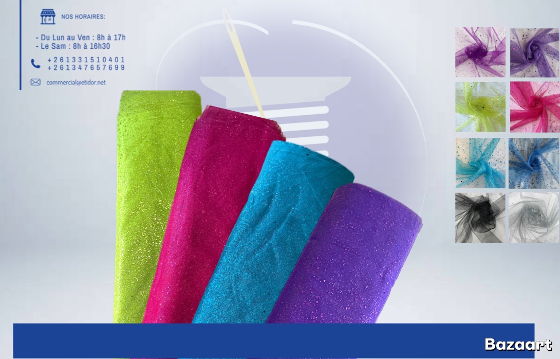 Voile pailletée fin et lumineux, offrant une transparence élégante et un scintillement subtil, idéal pour rehausser vos créations, décorations et accessoires d’une touche raffinée et festive. 💬Pour effectuer votre commande, veuillez prendre en photo le produit et valider vers ce lien: m.me/etidorshop ou contacter notre commercial aux : 📞 +261 34 02 270 83 / +261 33 15 104 01 📧commercial@etidor.net